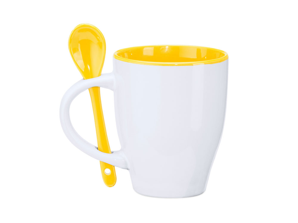 Керамическая кружка емкостью 350 мл. Цветная внутренняя часть и ложка в тон. Продукт подходит для использования в микроволновой печи и посудомоечной машине.