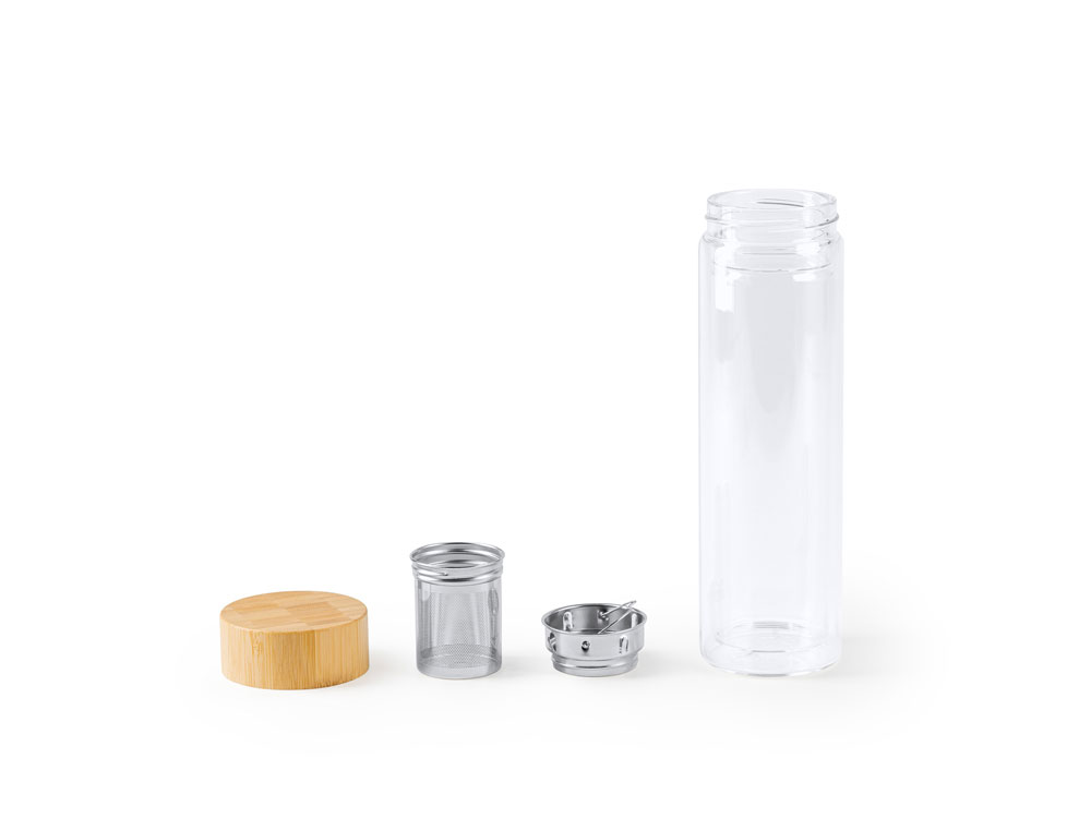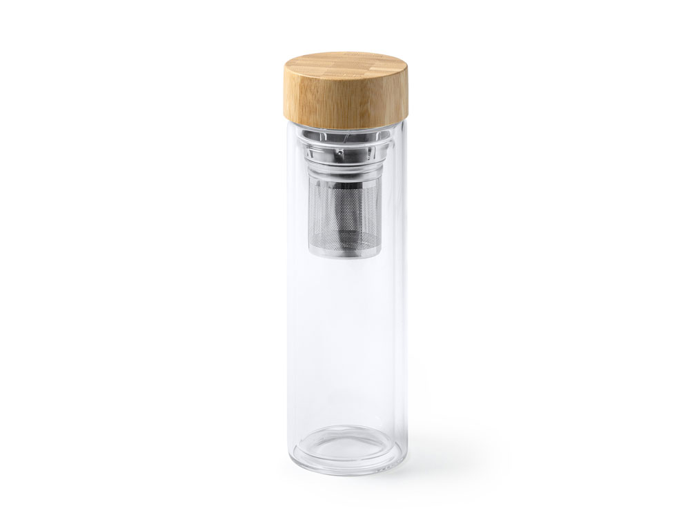 Бутылка из боросиликатного стекла с двойными стенками и бамбуковой крышкой. Включает ситечко для заваривания чая, так что вы можете взять его с собой куда угодно. Объем 420 мл.