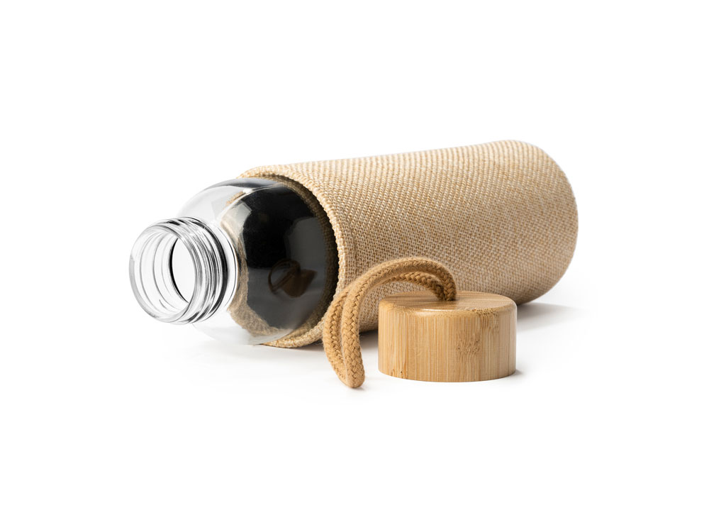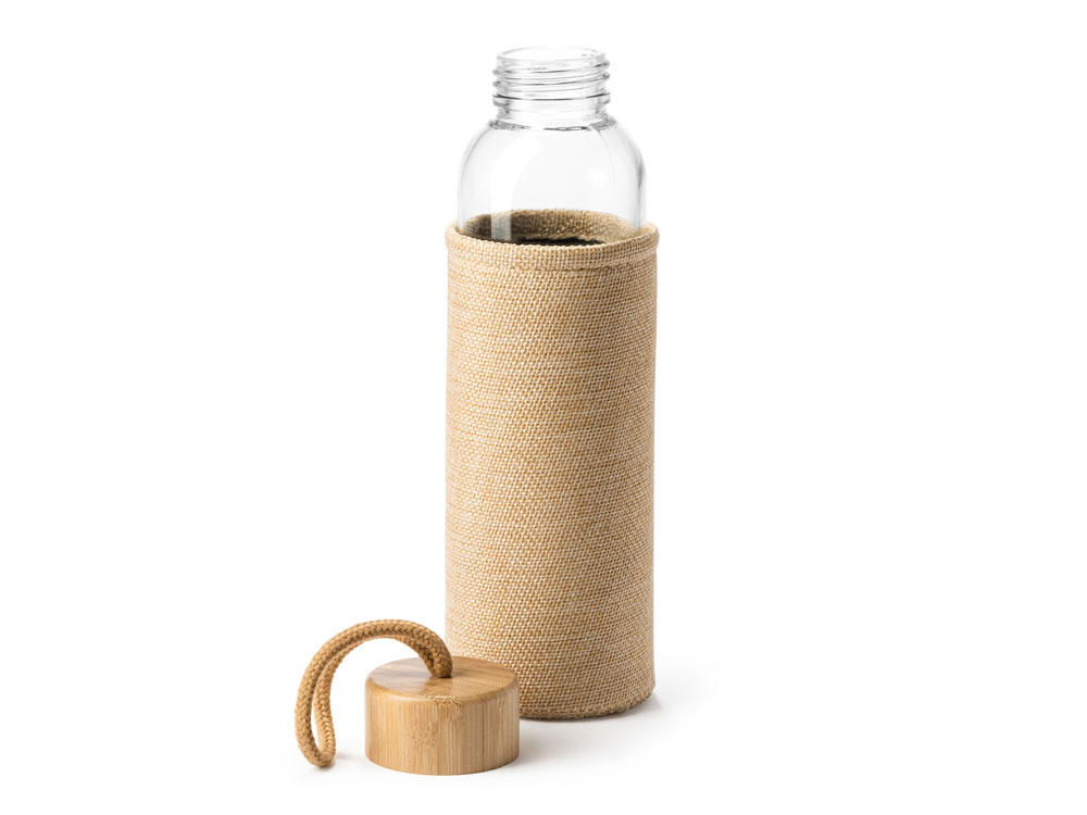 Стеклянная бутылка с оригинальным чехлом, имитирующим джут, и бамбуковой крышкой с практичной ручкой для переноски. Емкость 500 мл.