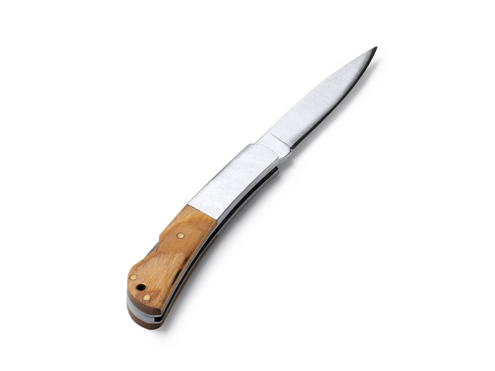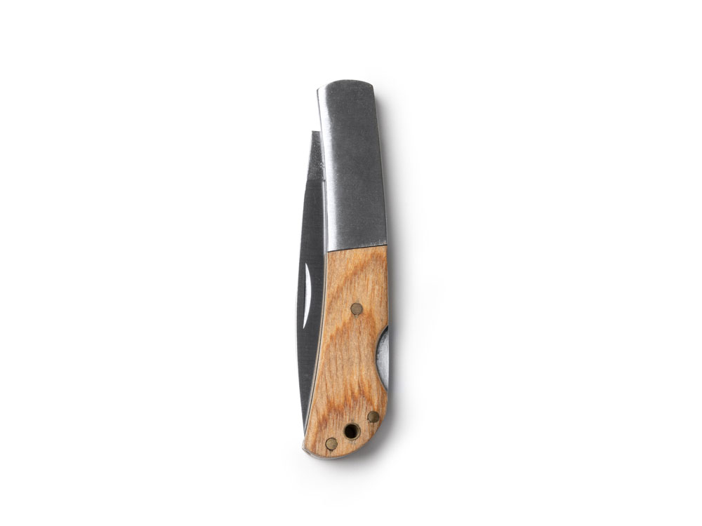Складной нож из нержавеющей стали в сочетании с натуральным деревом. Нож оснащен системой безопасности.